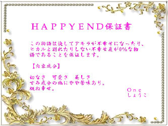 ちょびっとだけ「HAPPYEND保証書」も作ってみました。いや、本当に欲しい人いないだろうと思って限定先着十枚限りってことで(^^;勝手に折り込まれて入ってますので、それに当たった方はへらりと笑っていただければ嬉しいです。