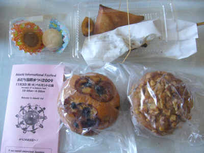 この間の国際ま/つりの戦利品。上の段左端から時計回りにシリアのお菓子、メキシコの揚げバナナとサモサ、ドイツの鳥の串焼き、下の段に来て、インドネシアのマフィン二つ。