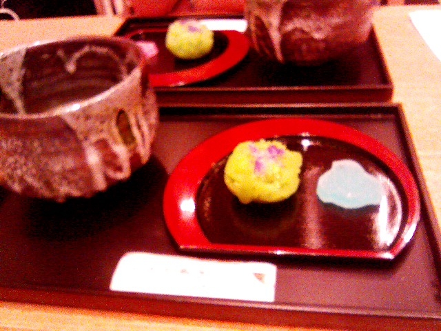 写真は甘味処のお抹/茶セット(^^)携帯の写真画像が悪くて良くわからないかと思いますが、片方は紫陽花??っぽい花のお菓子で右側は淡い水色の鳥のお菓子です。友人の鳥さんはピンク色で可愛かったですが私はブルーが好きなので水色の鳥で嬉しかったです。